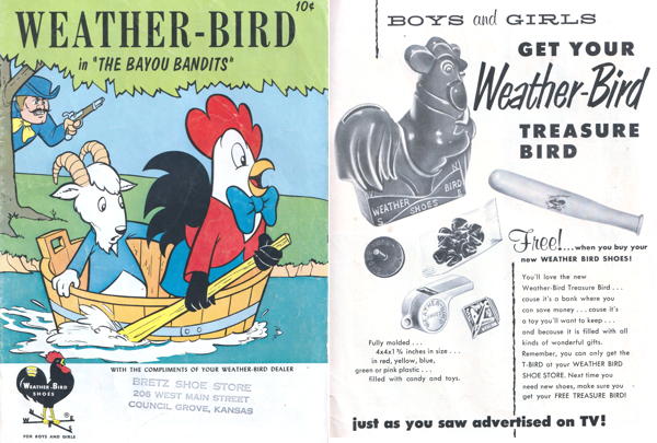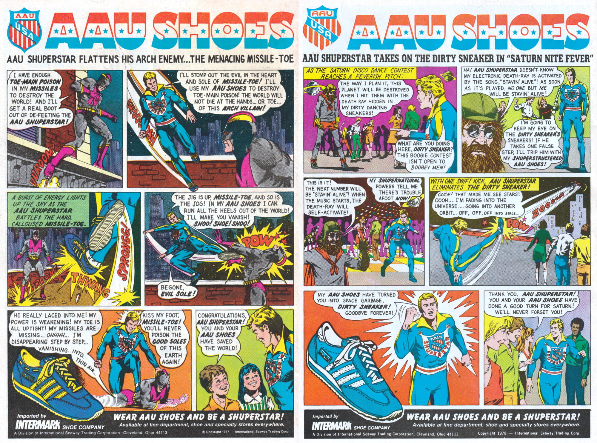 We're back from a quick visit to Albany, New York, where Kevin ran a half marathon (finishing in 309th place, probably not qualifying for the Olympics) and learned the shocking truth about Alice from The Brady Bunch. Now here in Chickentown, we're looking at an odd 1959 comic book called Weather-Bird. It stars a chicken and a goat, and the whole thing is a promotional gimmick to sell children's shoes. We love it. And we were reminded of some other weird comic book shoe ads. Several 1970s ads star a shoe-themed superhero called the AAU Shuperstar. One of his enemies is called Missile-Toe. And we can't stop thinking about them. We might have a problem.