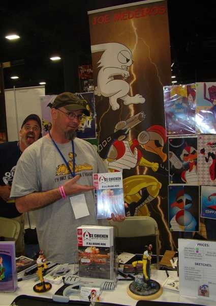 Here's Joe Medeiros, showing off issue #1 of Ace Chicken - Space Chicken and being photobombed by Hellion creator Jim Savard.