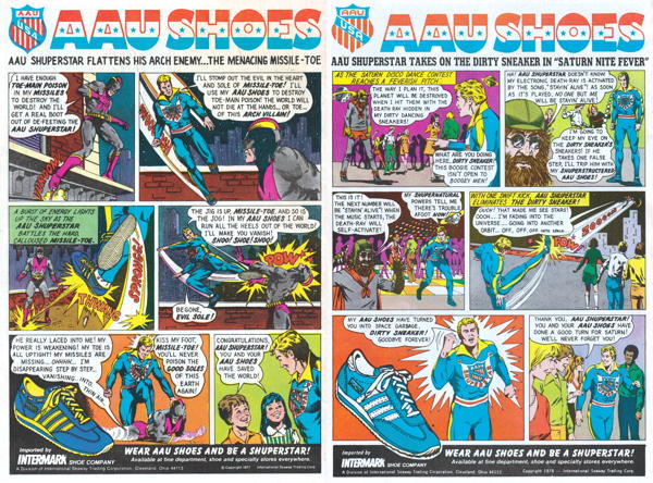 We're back from a quick visit to Albany, New York, where Kevin ran a half marathon (finishing in 309th place, probably not qualifying for the Olympics) and learned the shocking truth about Alice from The Brady Bunch. Now here in Chickentown, we're looking at an odd 1959 comic book called Weather-Bird. It stars a chicken and a goat, and the whole thing is a promotional gimmick to sell children's shoes. We love it. And we were reminded of some other weird comic book shoe ads. Several 1970s ads star a shoe-themed superhero called the AAU Shuperstar. One of his enemies is called Missile-Toe. And we can't stop thinking about them. We might have a problem.